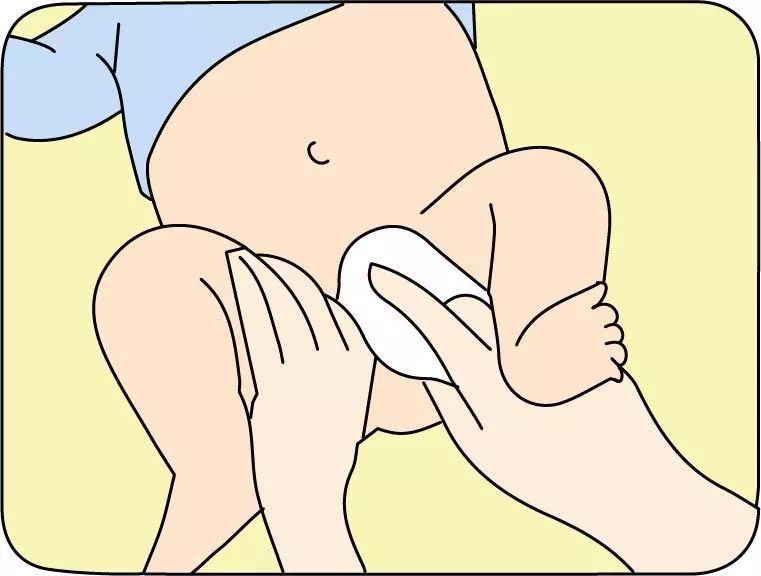 1)把在温水中浸湿的毛巾拧干,轻轻擦拭被纸尿裤覆盖的股沟、大腿里、夹缝处、私处;